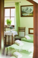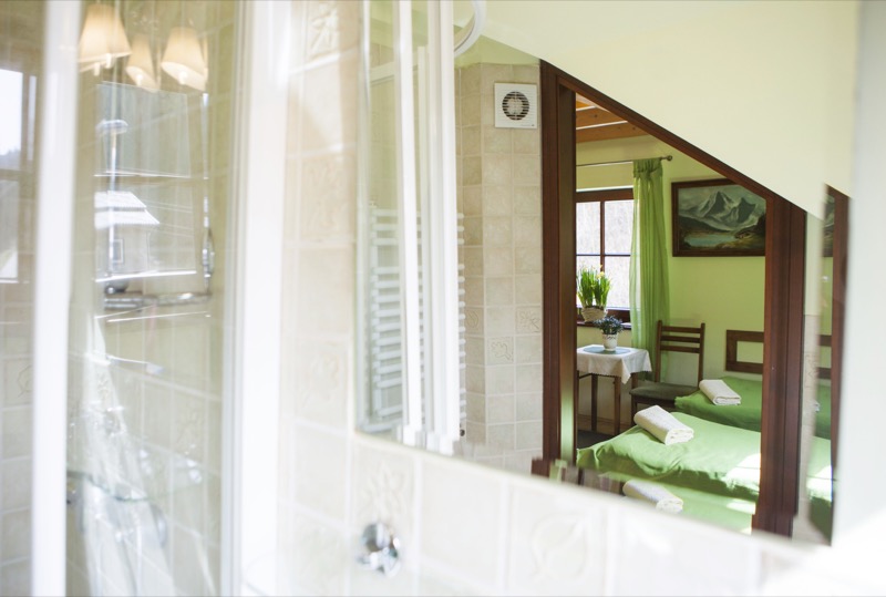 Dwuosobowy pokój utrzymany w ciepłych pistacjowych barwach z dwoma pojedynczymi łóżkami oraz prywatną łazienką w pokoju. Pokój ulokowany na jednym piętrze z ogólnodostępną kuchnią, na parterze dostępne pomieszczenie kominkowe.