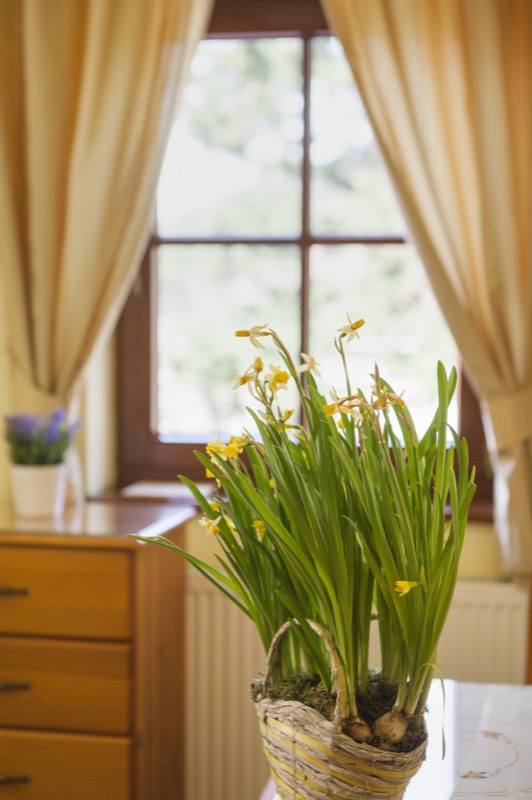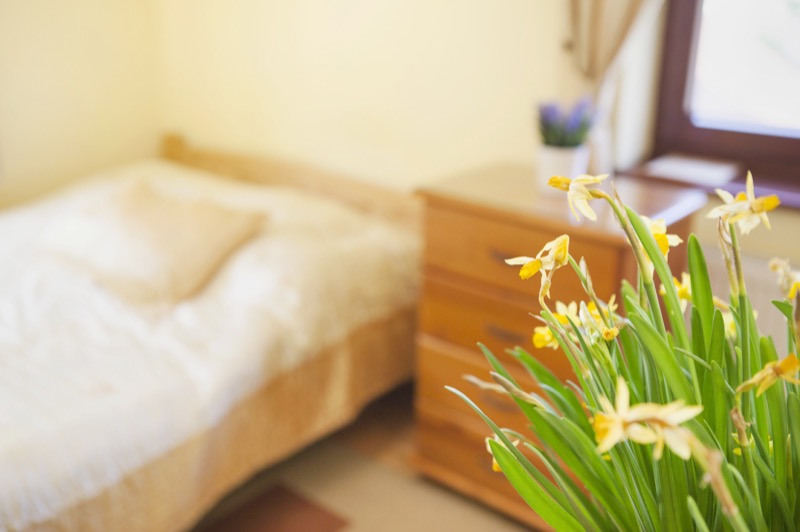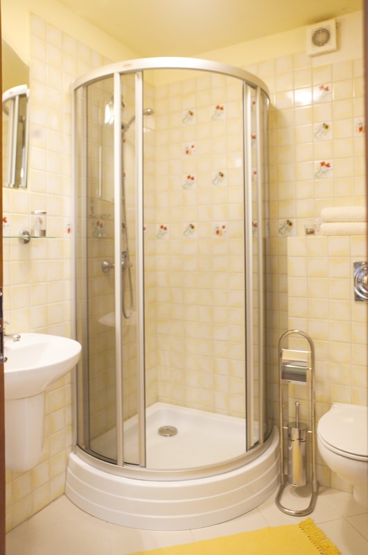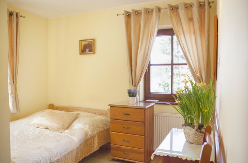 Pokój utrzymany w jasnej, złotej tonacji z jednym podwójnym łóżkiem oraz prywatną łazienką , na parterze dostępne pomieszczenie kominkowe, a powyżej ogólnodostępna kuchnia.